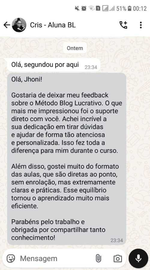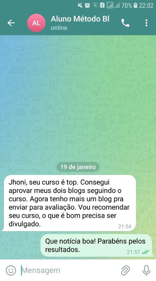 Você terá suporte personalizado via WhatsApp para responder suas dúvidas e ajudar nas configurações do seu blog. Além de ter acesso ao grupo de alunos no WhatsApp para poder interagir, tirar dúvidas e compartilhar conhecimento.